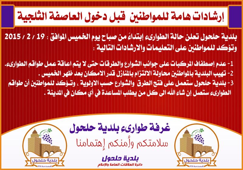 بلدية حلحول تعلن حالة الطوارىء إبتداءً من صباح يوم الخميس الموافق 19 / 2 / 2015 وتؤكد للمواطنين على التعليمات والارشادات التالية :-