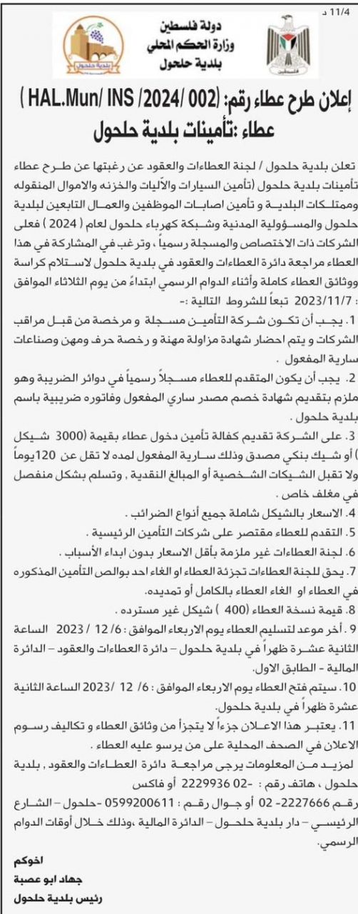 إعلان طرح عطاء عطاء:تأمينات بلدية حلحول المزيد