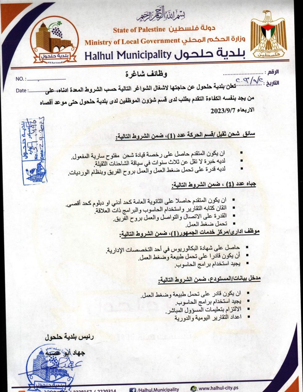 تعلن بلدية حلحول عن حاجتها لاشغال الشواغر التالية حسب الشروط المعدة أدناه، على من يجد بنفسه الكفاءة التقدم بطلب لدى قسم شؤون الموظفين لدى بلدية حلحول حتى موعد أقصاه الاربعاء 07/09/2023